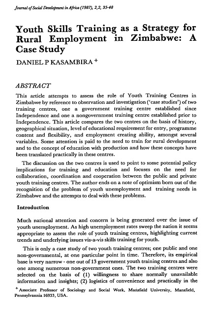 This article attempts to assess the role of Youth Training Centres in Zimbabwe by reference to observation and investigation ("case studies") of two training centres, one a government training centre established since Independence and one a nongovernment training centre established prior to Independence. This article compares the two centres on the basis of history, geographical situation, level of educational requirement for entry, programme content and flexibility, and employment creating ability, amongst several variables. Some attention is paid to the need to train for rural development and to the concept of education with production and how these concepts have been translated practically in these centres. The discussion on the two centres is used to point to some potential policy implications for training and education and focuses on the need for collaboration, coordination and cooperation between the public and private youth training centres. The author ends on a note of optimism born out of the recognition of the problem of youth unemployment and training needs in Zimbabwe and the attempts to deal with these problems.