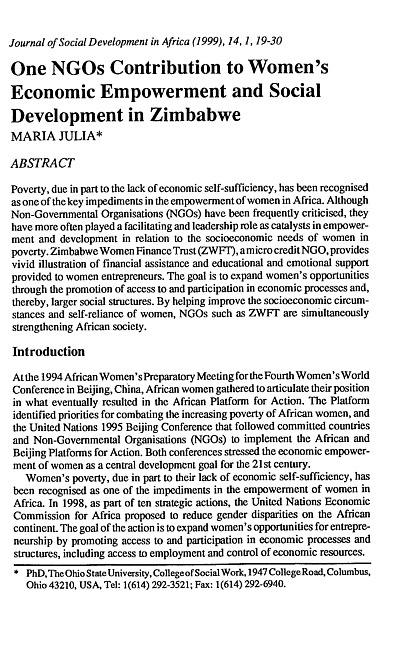Poverty, due in part to the lack of economic self-sufficiency, has been recognised as one of the key impediments in the empowerment of women in Africa. Although Non-Governmental Organisations (NGOs) have been frequently criticised, they have more often played a facilitating and leadership role as catalysts in empowerment and development in relation to the socioeconomic needs of women in poverty. Zimbabwe Women Finance Trust (ZWFT), a micro credit NGO, provides vivid illustration of financial assistance and educational and emotional support provided to women entrepreneurs. The goal is to expand women's opportunities through the promotion of access to and participation in economic processes and, thereby, larger social structures. By helping improve the socioeconomic circumstances and self-reliance of women, NGOs such as ZWFT are simultaneously strengthening African society.