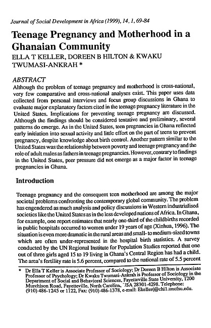 Although the problem of teenage pregnancy and motherhood is cross-national, very few comparative and cross-national analyses exist. This paper uses data collected from personal interviews and focus group discussions in Ghana to evaluate major explanatory factors cited in the teenage pregnancy literature in the United States. Implications for preventing teenage pregnancy are discussed. Although the findings should be considered tentative and preliminary, several patterns do emerge. As in the United States, teen pregnancies in Ghana reflected early initiation into sexual activity and little effort on the part of teens to prevent pregnancy, despite knowledge about birth control. Another pattern similar to the United States was the relationship between poverty and teenage pregnancy and the role of adult males as fathers in teenage pregnancies. However, contrary to findings in the United States, peer pressure did not emerge as a major factor in teenage pregnancies in Ghana.