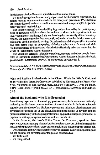 Review of: Teresa DeCrescenzo (ed). Gay and lesbian professionals in the closet. New York: Haworth Press, 1997