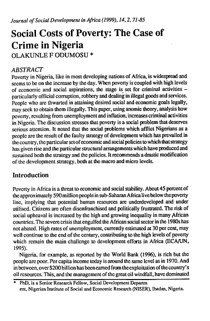 Poverty in Nigeria, like in most developing nations of Africa, is widespread and seems to be on the increase by the day. When poverty is coupled with high levels of economic and social aspirations, the stage is set for criminal activities - particularly official corruption, robbery and dealing in illegal goods and services. People who are thwarted in attaining desired social and economic goals legally, may seek to obtain them illegally. This paper, using anomie theory, analysis how poverty, resulting from unemployment and inflation, increases criminal activities in Nigeria. The discussion stresses that poverty is a social problem that deserves serious attention. It noted that the social problems which afflict Nigerians as a people are the result of the faulty strategy of development which has prevailed in the country, the particular set of economic and social policies to which that strategy has given rise and the particular structural arrangements which have produced and sustained both the strategy and the policies. It recommends a drastic modification of the development strategy, both at the macro and micro levels.