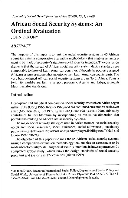 The purpose of this paper is to rank the social security systems in 45 African countries using a comparative evaluation methodology that enables an assessment to be made of a country's statutory social security intention. The conclusion drawn is that the spread of African social security system design standards are comparable to those of Latin American countries, although the poorest designed African systems arc somewhat superior to their Latin American counterpart. The very best designed African social security systems arc in North Africa: Tunisia (with its world-class family support program), Algeria and Libya, although Mauritius also stands out.