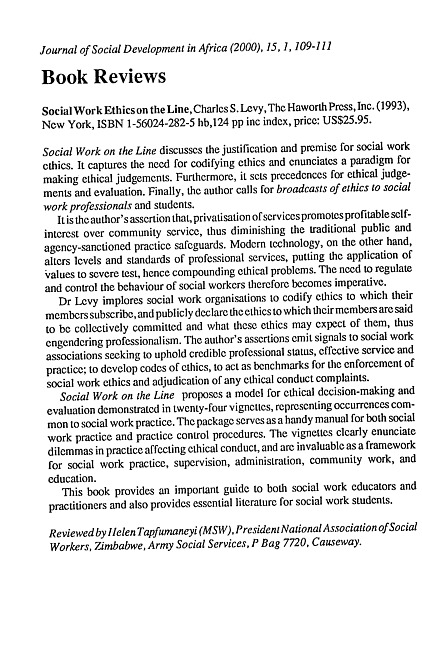Review of: Charles S. Levy. Social work ethics on the line. New York: Haworth Press, 1993