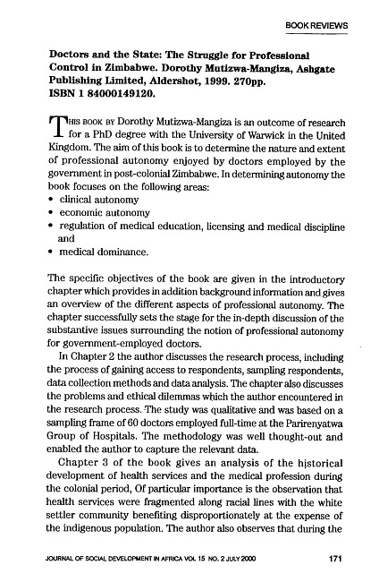Review of: Dorothy Mutizwa-Mangiza. Doctors and the state. Aldershot: Ashgate Publishing, 1999