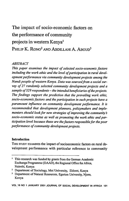 This paper examines the impact of selected socio-economic factors including the work ethic and the level of participation in rural development performance via community development projects among the Nandi people of western Kenya. Data was sourced from a social survey of 27 randomly selected community development projects and a sample of329 respondents - the intended beneficiaries of the projects. The findings support the prediction that the prevailing work ethic, socio-economic factors and the participation in such projects have a paramount influence on community development performance. It is recommended that development planners, policymakers and implementers should look for new strategies of improving the community’s socio-economic status as well as promoting the work ethic and participation level because these are the factors responsible for the poor performance of community development projects.