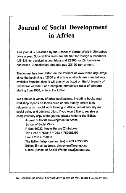Journal of social development in Africa. Vol. 16 No. 1 (2001 January)