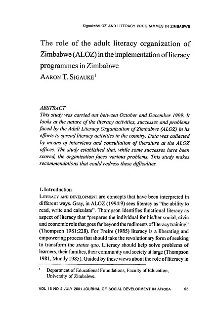 This study was carried out between October and December 1999. It looks at the nature of the literacy activities, successes and problems faced by the Adult Literacy Organization of Zimbabwe (ALOZ) in its efforts to spread literacy activities in the country. Data was collected by means of interviews and consultation of literature at the ALOZ offices. The study established that, while some successes have been scored, the organization faces various problems. This study makes recommendations that could redress these difficulties.