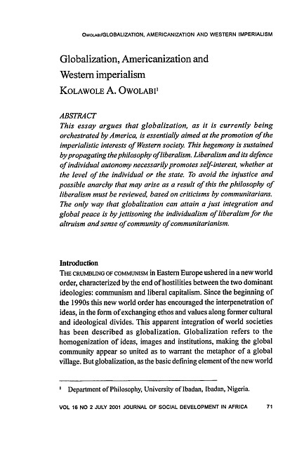 This essay argues that globalization, as it is currently being orchestrated by America, is essentially aimed at the promotion of the imperialistic interests of Western society. This hegemony is sustained by propagating the philosophy of liberalism. Liberalism and its defense of individual autonomy necessarily promotes self-interest, whether at the level of the individual or the state. To avoid the injustice and possible anarchy that may arise as a result of this the philosophy of liberalism must be reviewed, based on criticisms by communitarians. The only way that globalization can attain a just integration and global peace is by jettisoning the individualism of liberalism for the altruism and sense of community of communitarianism.
