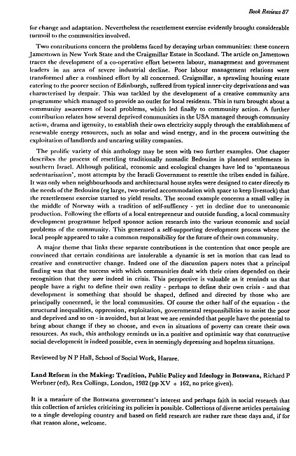 Review of: Richard P. Werbner (ed.). Land reform in the making. London: Rex Collings, 1982