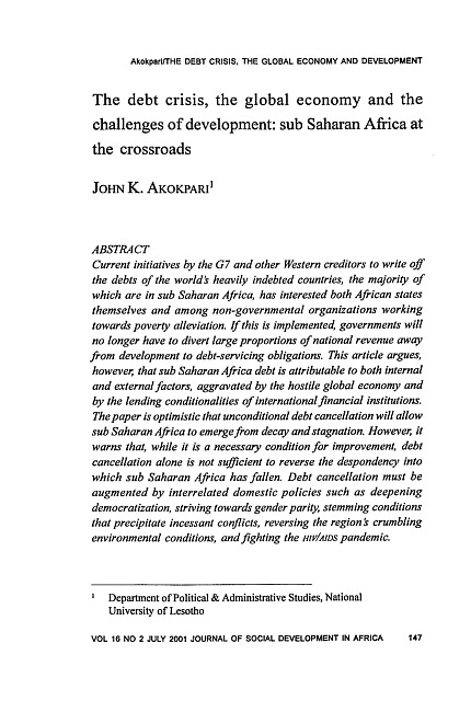 Current initiatives by the G7 and other Western creditors to write off the debts of the world's heavily indebted countries, the majority of which are in Sub-Saharan Africa, has interested both African states themselves and among non-governmental organizations working towards poverty alleviation. If this is implemented, governments will no longer have to divert large proportions of national revenue away from development to debt-servicing obligations. This article argues, however, that Sub-Saharan Africa debt is attributable to both internal and external factors, aggravated by the hostile global economy and by the lending conditionalities of international financial institutions. The paper is optimistic that unconditional debt cancellation will allow Sub-Saharan Africa to emerge from decay and stagnation. However, it warns that, while it is a necessary condition for improvement, debt cancellation alone is not sufficient to reverse the despondency into which Sub-Saharan Africa has fallen. Debt cancellation must be augmented by interrelated domestic policies such as deepening democratization, striving towards gender parity, stemming conditions that precipitate incessant conflicts, reversing the region’s crumbling environmental conditions, and fighting the HIV/AIDS pandemic.