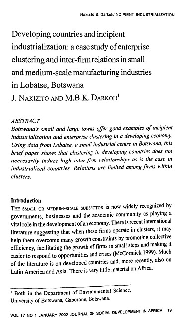 Botswana’s small and large towns offer good examples of incipient industrialization and enterprise clustering in a developing economy. Using data from Lobatse, a small industrial centre in Botswana, this brief paper shows that clustering in developing countries does not necessarily induce high inter-firm relationships as is the case in industrialized countries. Relations are limited among firms within clusters.
