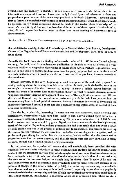 Review of: Jean Bonvin. Social attitudes and agricultural productivity in Central Africa. Paris: Development Centre of the Organisation of Economic Co-operation and Development, 1986