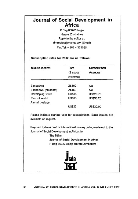 Journal of social development in Africa. Vol. 17 No. 2 (2002 July)