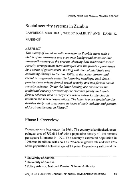 This survey of social security provision in Zambia starts with a sketch of the historical and economic background since the late nineteenth century to the present, showing how traditional social security arrangements were destroyed and the people impoverished by a series of governments, starting with the colonial State and continuing through to the late 1990.1'.It describes current and recent arrangements under the following headings: both State provided and private formal social security and non-formal social security schemes_ Under the latter heading are considered the traditional security provided by the extended family and semiformal schemes such as reciprocal urban networks. the church chilimba and market associations. The latter two are singled out for detailed study and assessment in terms of their viability and potential for strengthening, in Phase II.