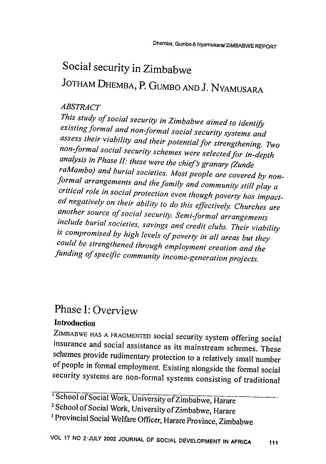 This study of social security in Zimbabwe aimed to identify existing formal and non-formal social security systems and assess their viability and their potential for strengthening. Two non-formal social security schemes were selected for in-depth analysis in Phase II: these were the chief's granary (Zunde raMambo) and burial societies. Most people are covered by nonformal arrangements and the family and community still play a critical role in social protection even though poverty has impacted negatively on their ability to do this effectively. Churches are another source of social security. Semi-formal arrangements include burial societies, savings and credit clubs, Their viability is compromised by high levels of poverty in all areas but they could be strengthened through employment creation and the funding of specific community income-generation projects.