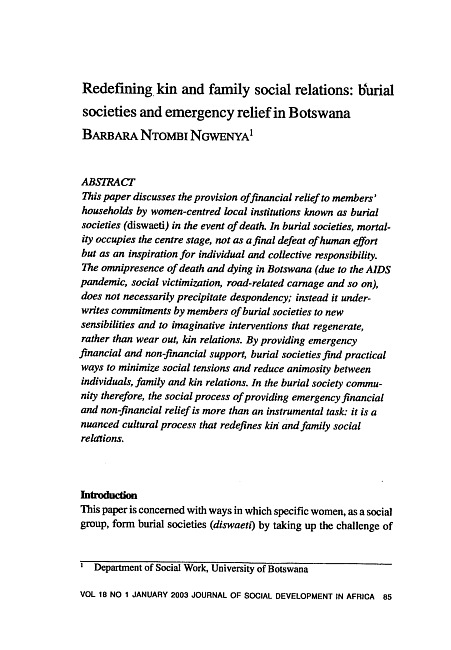 Redefining kin and family social relations : burial societies and emergency relief in Botswana
