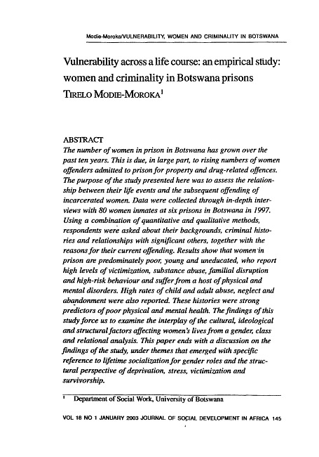 Vulnerability across a life course : an empirical study: women and criminality in Botswana prisons