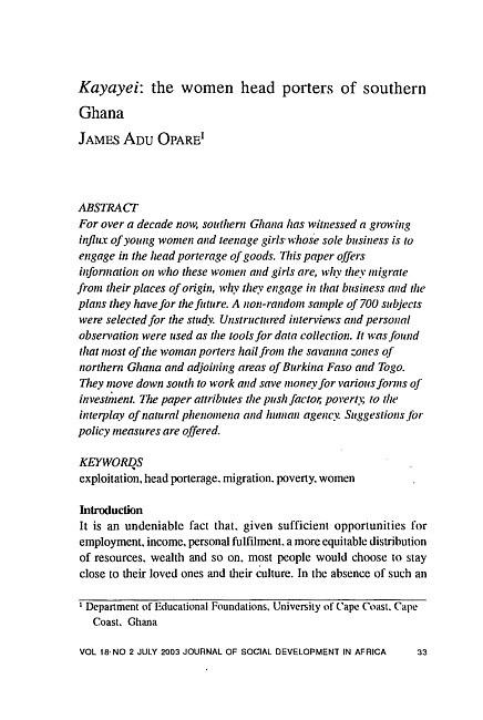 For over a decade now, southern Ghana has witnessed a growing influx of young women and teenage girls-whose sole business is to engage in the lie ad porterage of goods. This paper offers information on who these women and girls are, why they migrate from their places of origin, why they engage in that business and the plans they have for the future. A non-random sample of 700 subjects were selected for the study. Unstructured interviews and personal observation were used as the tools for data collection. It was found that most of the woman porters hail from the savanna zones of northern Ghana and adjoining areas of Burkina Faso and Togo. They move down south to work and save money for various forms of investment. The paper attributes the push factor, poverty, to the interplay of natural phenomena and human agency. Suggestions for policy measures are offered.