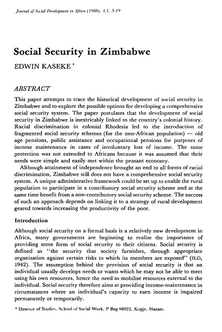This paper attempts to trace the historical development of social security in Zimbabwe and to explore the possible options for developing a comprehensive social security system. The paper postulates that the development of social security in Zimbabwe is inextricably linked to the country's colonial history. Racial discrimination in colonial Rhodesia led to the introduction of fragmented social security schemes (for the non-African population) old age pensions, public assistance and occupational pensions for purposes of income maintenance in cases of involuntary loss of income. The same protection was not extended to Africans because it was assumed that their needs were simple and easily met within the peasant economy. Although attainment of independence brought an end to all forms of racial discrimination, Zimbabwe still does not have a comprehensive social security system. A unique administrative framework could be set up to enable the rural population to participate in a contributory social security scheme and at the same time benefit from a non-contributory social security scheme. The success of such an approach depends on linking it to a strategy of rural development geared towards increasing the productivity of the poor.