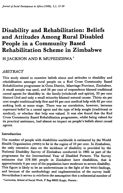 Disability and rehabilitation : beliefs and attitudes among rural disabled people in a community based rehabilitation scheme in Zimbabwe