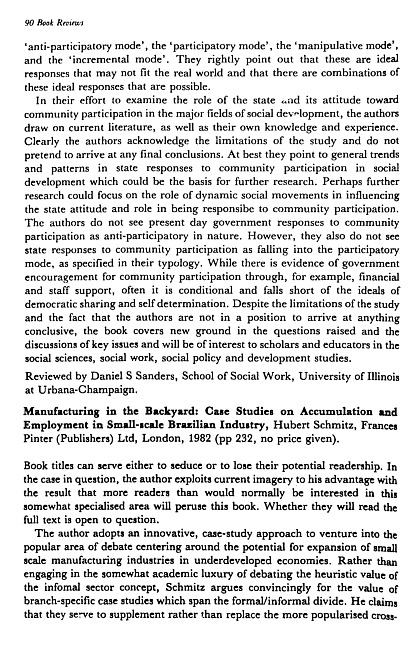 Review of: Hubert Schmitz. Manufacturing in the backyard. London: Frances Pinter (Publishers), 1982