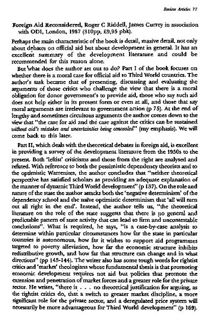 Review of: Roger C. Riddell. Foreign aid reconsidered. London: James Currey in association with ODI, 1987