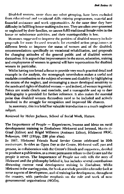 Review of: Martin de Graaf and Brigid Willmore (eds.). The importance of people. Bulawayo, Zimbabwe: Hlekweni FRSC, 1987