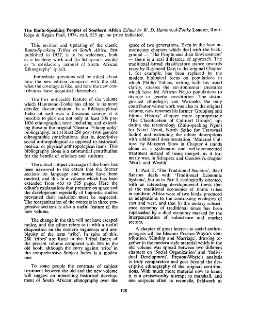 Review of: W.D. Hammond-Tooke (ed). The Bantu-speaking peoples of Southern Africa. London: Routledge & K. Paul, 1974