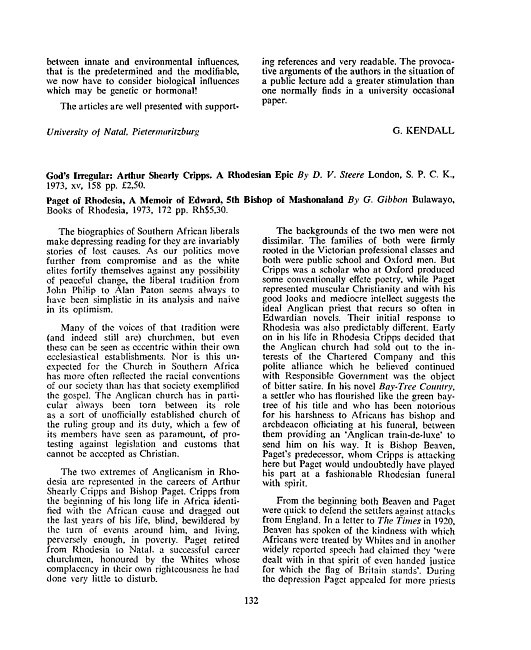 Review of: Douglas V. Steere. God's irregular. London: S.P.C.K., 1973, and Geoffrey Gibbon. Paget of Rhodesia. Bulawayo: Books of Rhodesia, 1973