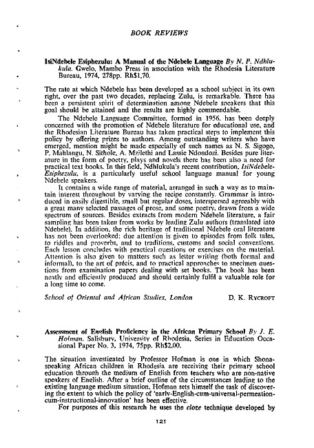 Review of: John E. Hofman. Assessment of English proficiency in the African primary school. Salisbury: University of Rhodesia, 1974