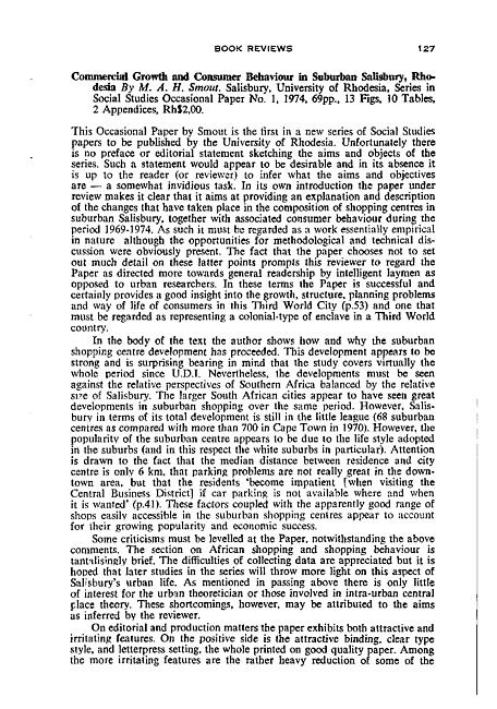 Review of: M.A.H. Smout. Commercial growth and consumer behaviour in suburban Salisbury, Rhodesia. Salisbury: University of Rhodesia, 1974