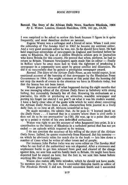 Review of: Eugene Wason. Banned, the story of the African Daily News, Southern Rhodesia, 1964. London: Hamish Hamilton, 1976