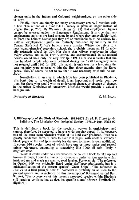 Review of: Michael P. Stuart Irwin. A bibliography of the birds of Rhodesia, 1873-1977. Salisbury: Rhodesian Ornithological Society, 1978