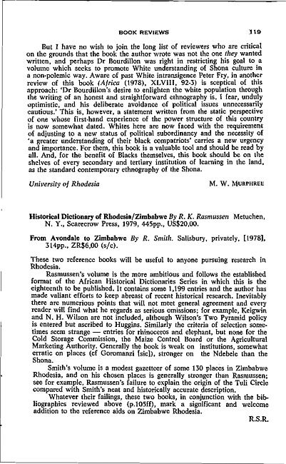 Review of: R. Kent Rasmussen. Historical dictionary of Rhodesia/Zimbabwe. Metuchen, N.J.: Scarecrow Press, 1979; R. Smith. From Avondale to Zimbabwe. Salisbury, 1978
