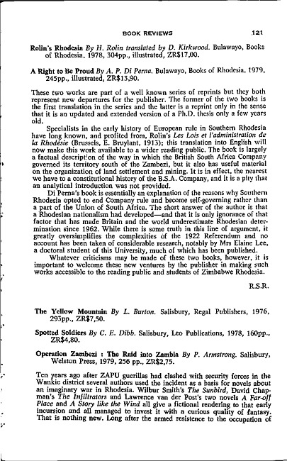 Review of: Lloyd Burton. The yellow mountain. Salisbury: Regal Publishers, 1976; C.E. Dibb. Spotted soldiers. Salisbury: Leo Publications, 1978; Peter Armstrong. Operation Zambezi. Salisbury: Welston, 1979
