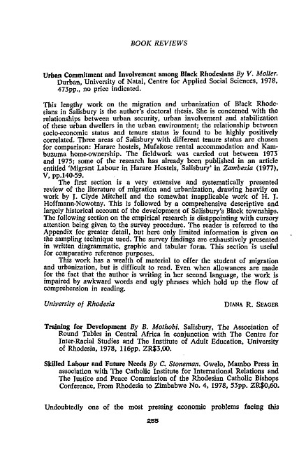 Review of: B. Mothobi. Training for development. Salisbury: Association of Round Tables in Central Africa in conjunction with the Centre for Inter-Racial Studies and the Institute of Adult Education, University of Rhodesia, 1978; Colin Stoneman. Skilled labour and future needs. Gwelo: Mambo Press in association with the Catholic Institute for International Relations and the Justice and Peace Commission of the RCBC, 1978