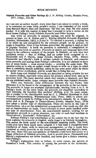 Review of: J.N. Pelling. Ndebele proverbs and other sayings. Gwelo: Mambo Press, 1977