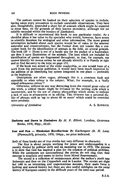 Review of: Hugh P. Elliott. Darkness and dawn in Zimbabwe. London: Grosvenor Books, 1978; Kachengere (R.H. Lees). Fear and fun. Plymouth, 1978