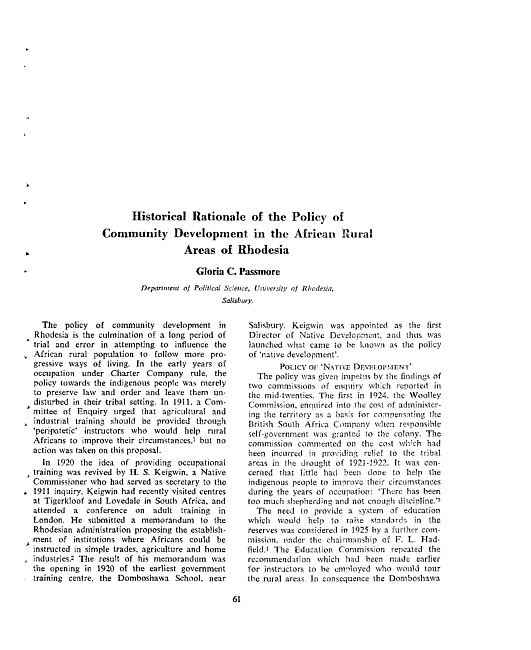 Historical rationale of the policy of community development in the African rual areas of Rhodesia