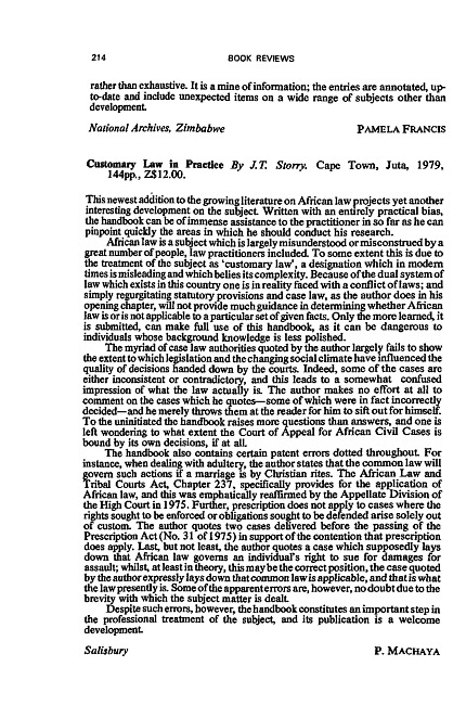 Review of: J.G. Storry. Customary law in practice. Cape Town: Juta, 1979