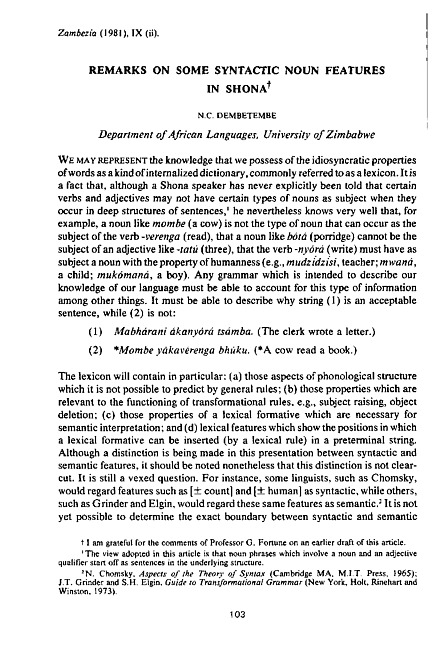 Remarks on some syntactic noun features in Shona