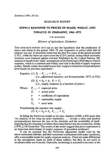Supply response to prices of maize, wheat, and tobacco in Zimbabwe, 1961-1975