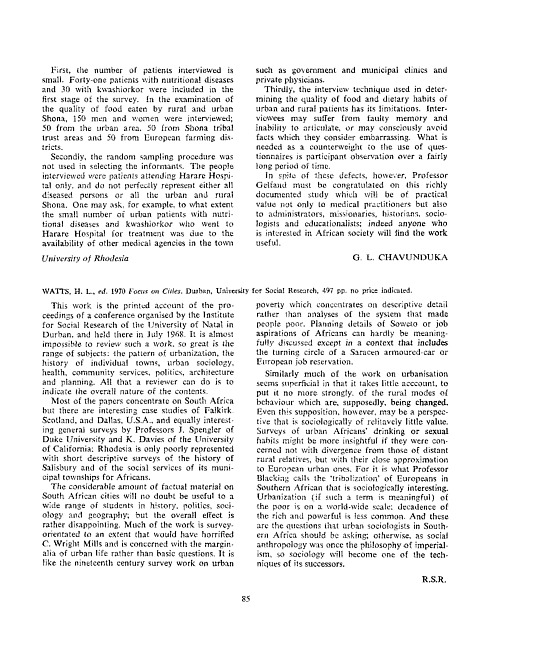Review of: H.L. Watts (ed). Focus on cities. Durban: University of Natal, Institute for Social Research, 1970