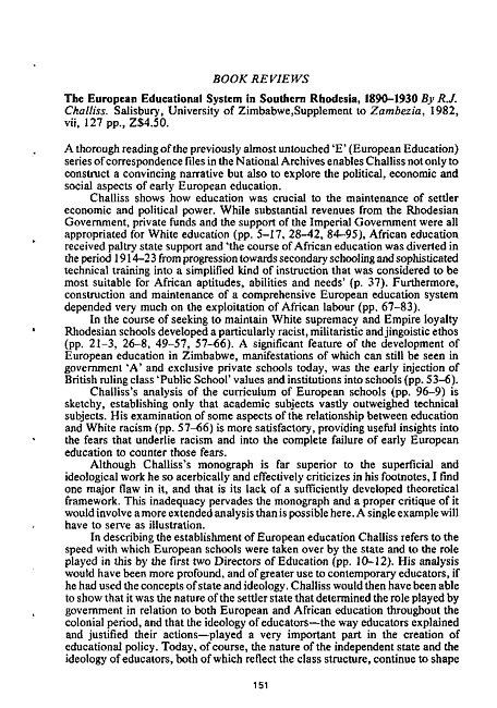 Book review : The European educational system in southern Rhodesia, 1890-1930 by R.J. Challiss