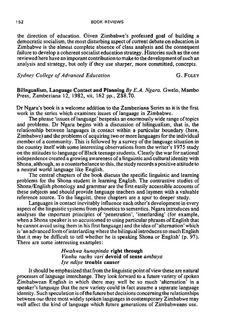 Review of: E.A. Ngara. Bilingualism, language contact, and language planning. Gwelo: Mambo Press, 1982