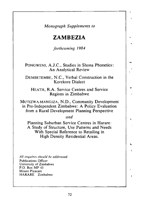 Advertisement : Monograph supplements to Zambezia forthcoming 1984