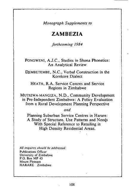 Advertisement : Monograph supplements to Zambezia forthcoming 1984 ZAMBEZIA