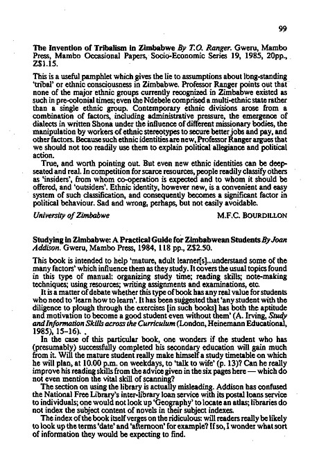 Review of: Terence Ranger. The invention of tribalism in Zimbabwe. Gweru: Mambo Press, 1985
