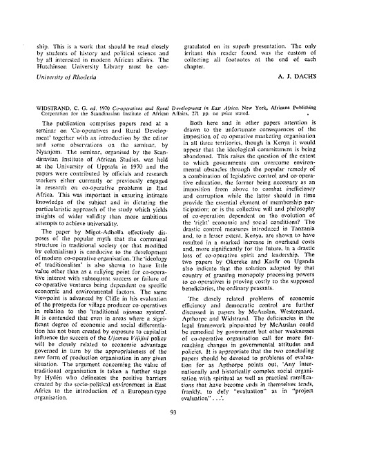 Review of: Carl Gösta Widstrand (ed). Co-operatives and rural development in East Africa. New York: Africana Pub. Corp, 1970