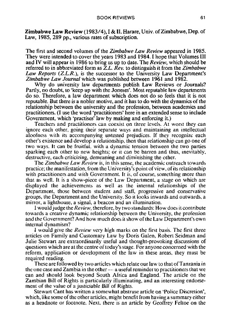 Review of: Zimbabwe law review (1983/4), I & II. Harare: University of Zimbabwe, Department of Law, 1985